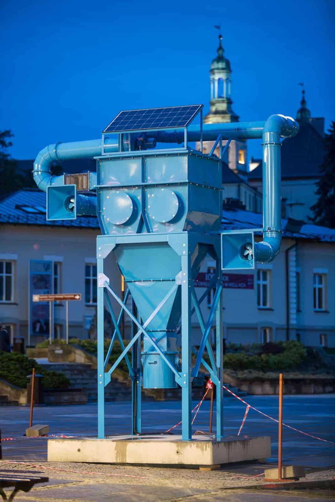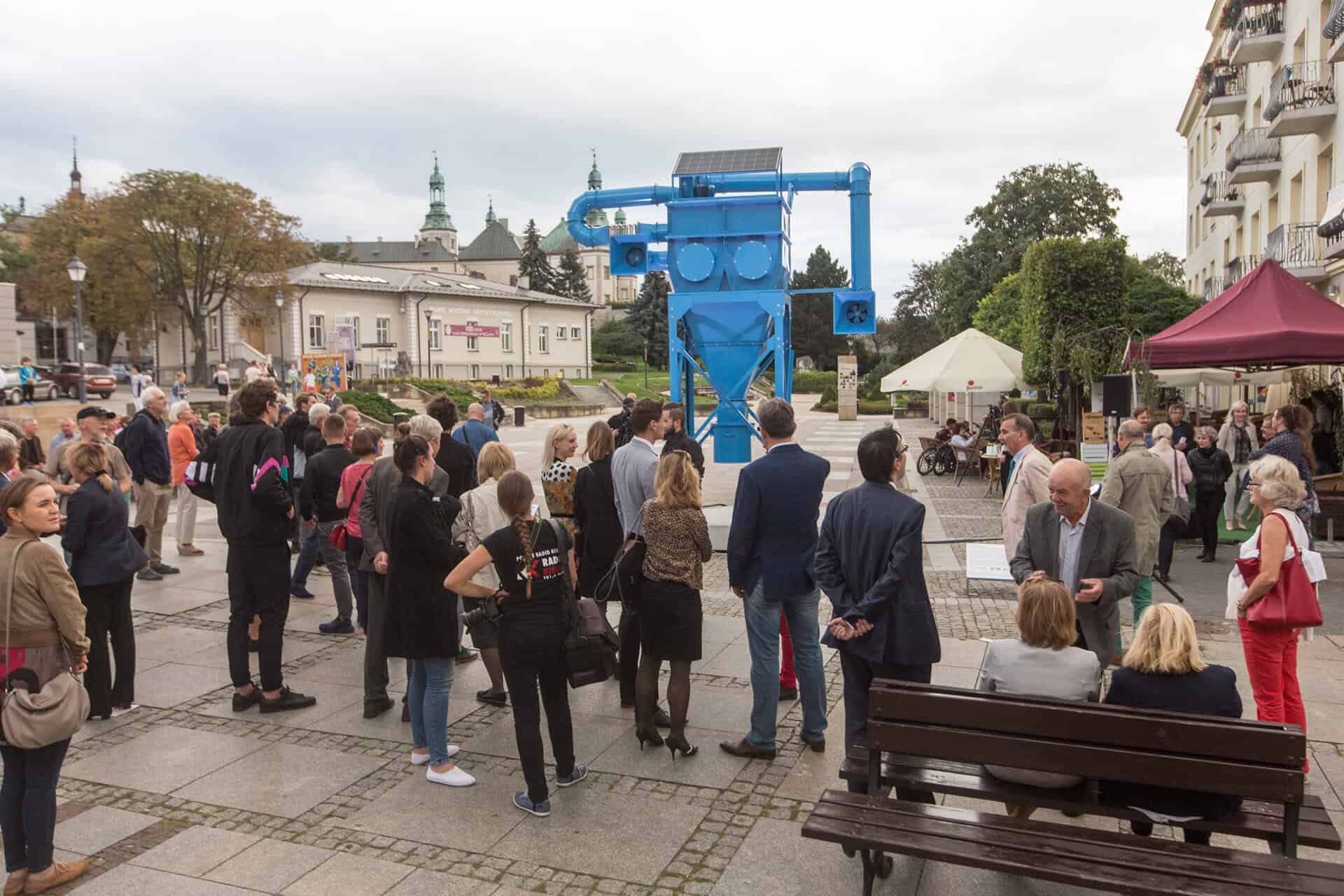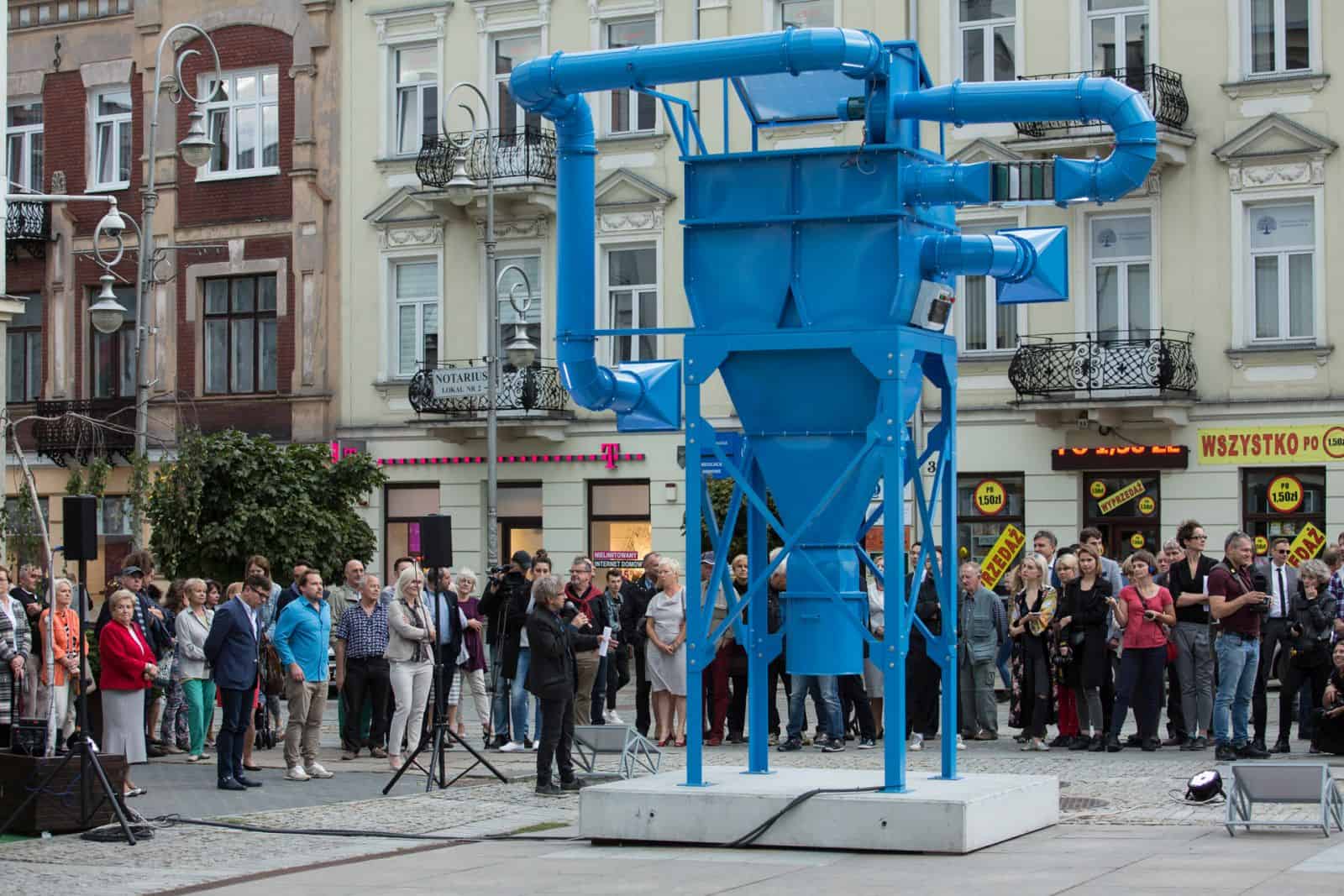 W rankingu 50 najbardziej zanieczyszczonych miast w Europie, przygotowanym przez Światową Organizację Zdrowia (WHO), znalazły się aż 33 Polskie miasta. W styczniu 2017 roku w południowej Polsce odnotowano rekordowo duże zanieczyszczenie powietrza – normy przekroczone zostały o ponad 3 000%. Problem smogu i zanieczyszczeń jest aktualny niezależnie od sezonu i dotyczy każdego. Za szkodliwość smogu odpowiedzialne są przede wszystkim cząstki o średnicy mniejszej niż 10 mikrometrów (przede wszystkim cząstki PM10 i PM2,5). To właśnie te cząstki będzie filtrować „Zjadacz kurzu” – nowa artystyczna realizacja Kuby Bąkowskiego, która we wrześniu 2017 roku stanie w centrum Kielc. „Zjadacz kurzu” to hybryda sztuki i przemysłu. Łączy postfuturystyczne postulaty artystyczne z zaawansowaną inżynierią przemysłową. Punktem wyjścia jest dla mnie nie tylko ekologia, ale również historia regionu. Kielce leżą na terenach najstarszego w Polsce okręgu górniczo-hutniczego i do dzisiaj są ważnym ośrodkiem przemysłowym. „Zjadacz kurzu” łączy ze sobą świat maszyn, nowych technologii i sztuki, łączy historię regionu z jego współczesnością i podejmuje temat odpowiedzialności za przyszłość. – mówi Bąkowski. „Zjadacz kurzu” stanie na Placu Artystów, w samym sercu Kielc i w centrum największego traktu komunikacyjnego miasta – ulicy Henryka Sienkiewicza. Publiczne odsłonięcie odbędzie się 14 września o godzinie 18:00, maszyna będzie filtrowała miejskie powietrze do 31 października 2017 r. To „oczyszczenie” prócz wymiaru symbolicznego i rytualnego ma również swój wymiar praktyczny i edukacyjny. Praktyczny, ponieważ rzeźba wyposażona w nowoczesne systemy filtracjifaktycznie będzie oczyszczać powietrze, edukacyjny, ponieważ wyposażona we została własny czujnik zanieczyszczeń, dzięki czemu będzie jedyną w swoim rodzaju stacją kontroli jakości powietrza. Jakość „wydychanych” przez nią gazów będzie można sprawdzać na bieżąco na stronie www.zjadaczkurzu.org. W pełni responsywna strona ruszy 5 września 2017 roku.