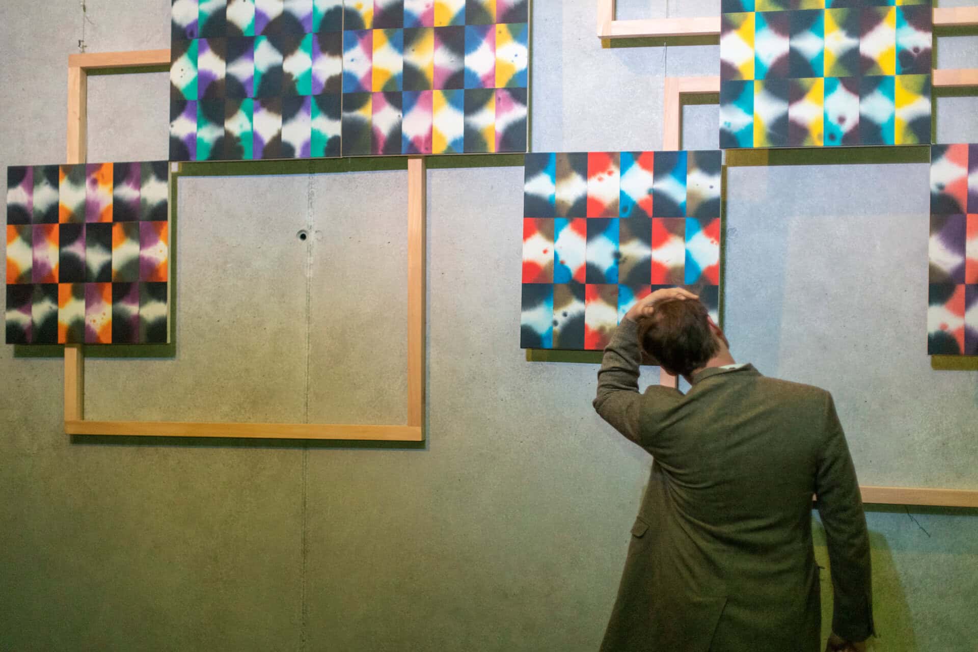„Realizacja ,,Falling out of Rhythm / Wypadanie z rytmu” odnosi się do powtarzalności jaką charakteryzuje się struktura kalendarza. Inspiracją stał się kalendarz jako pewien system opisujący cykl roczny – następujących po sobie dni czy miesięcy, które zostają wypełnione rzeczywistymi zdarzeniami. System ten został przetransponowany na język abstrakcyjnych form i sposób organizacji całej kompozycji obrazu. Regularny, geometryczny rytm koegzystuje z nie do końca kontrolowanym gestem rozlewania tuszu. Plamy koloru są intencjonalne lecz przypadkowe – nie można zapanować nad ich kształtem. Obraz łączy na zasadzie sprzeczności uporządkowany schemat z przypadkiem, regularną ciągłość z niepowtarzalnością z czy jednakowość z wyjątkowością”.
