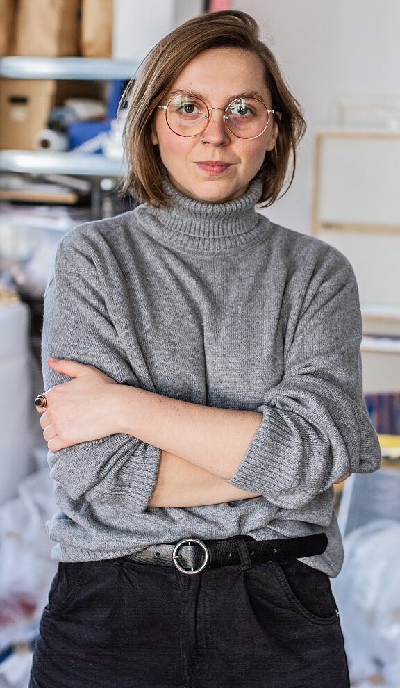 Kinga Popiela Urodzona w 1991 w Kaliszu, obecnie mieszka i pracuje w Poznaniu. Dyplom magisterski zrealizowała na Wydziale Malarstwa Uniwersytetu Artystycznego w Poznaniu w pracowni prof. dr hab. Dominika Lejmana i prof. dr hab. Andrzeja Pepłońskiego. W 2022 roku obroniła pracę doktorską pt.: „Postpictor. Ciało narzędziem”. Jej pole zainteresowań dzieli się na dwa obszary. Pierwszy to część twórcza i wizualna: obrazy i prace na papierze, które stanowią przestrzeń do myślenia o geście, kolorze, skali obrazu oraz jego wpływie na odbiorcę. Pracuje głównie w obszarze abstrakcji geometrycznej, którą łączy z ekspresją ciała. Część druga jej zainteresowań to próba obserwacji i analizy procesu twórczego oraz wszelkich zagadnień mu towarzyszących: wpływu otaczającego świata na jednostkę, potencjalność pogłębiania procesu twórczego oraz możliwości poszerzenia umiejętności manualnych poprzez ćwiczenia fizyczne oraz rozwój samoświadomości. Postępy w tym obszarze publikuje w formie tekstów oraz prac naukowych. Laureatka oraz finalistka wielu konkursów i przeglądów sztuki, swoje prace pokazywała na wystawach zbiorowych i indywidualnych w Polsce oraz zagranicą, m. in. w: Galerii Bielska BWA, Galerii Sztuki Wozownia w Toruniu, Fundacji im. Stefana Gierowskiego w Warszawie, Galerii BWA Wrocław Główny, Galerii Sztuki im. Jana Tarasina w Kaliszu czy Galerii Labirynt w Lublinie.